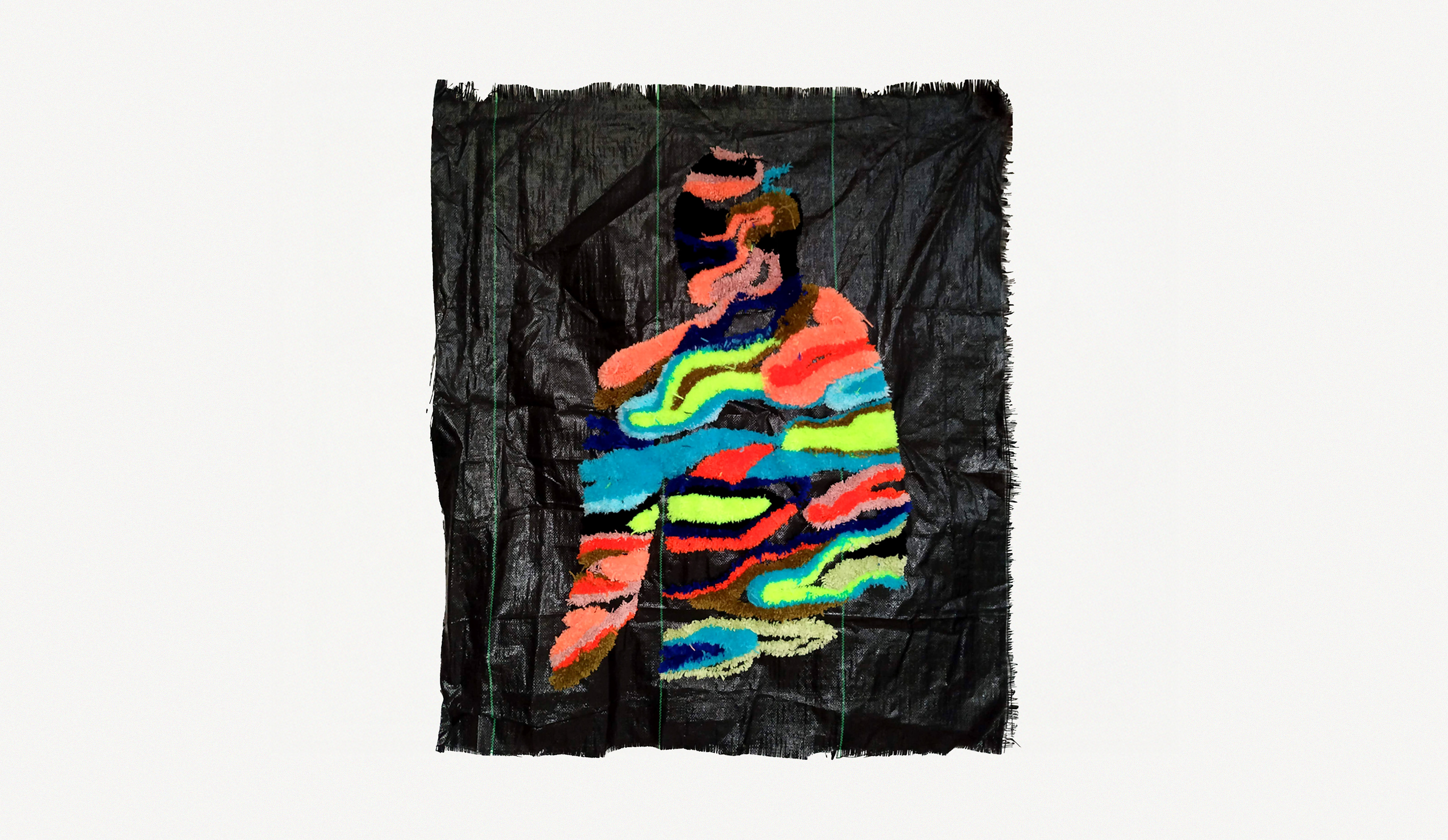 fabric installation, base made of polypropylene sacks, neon yarn, recycled materials, reclaimed yarn