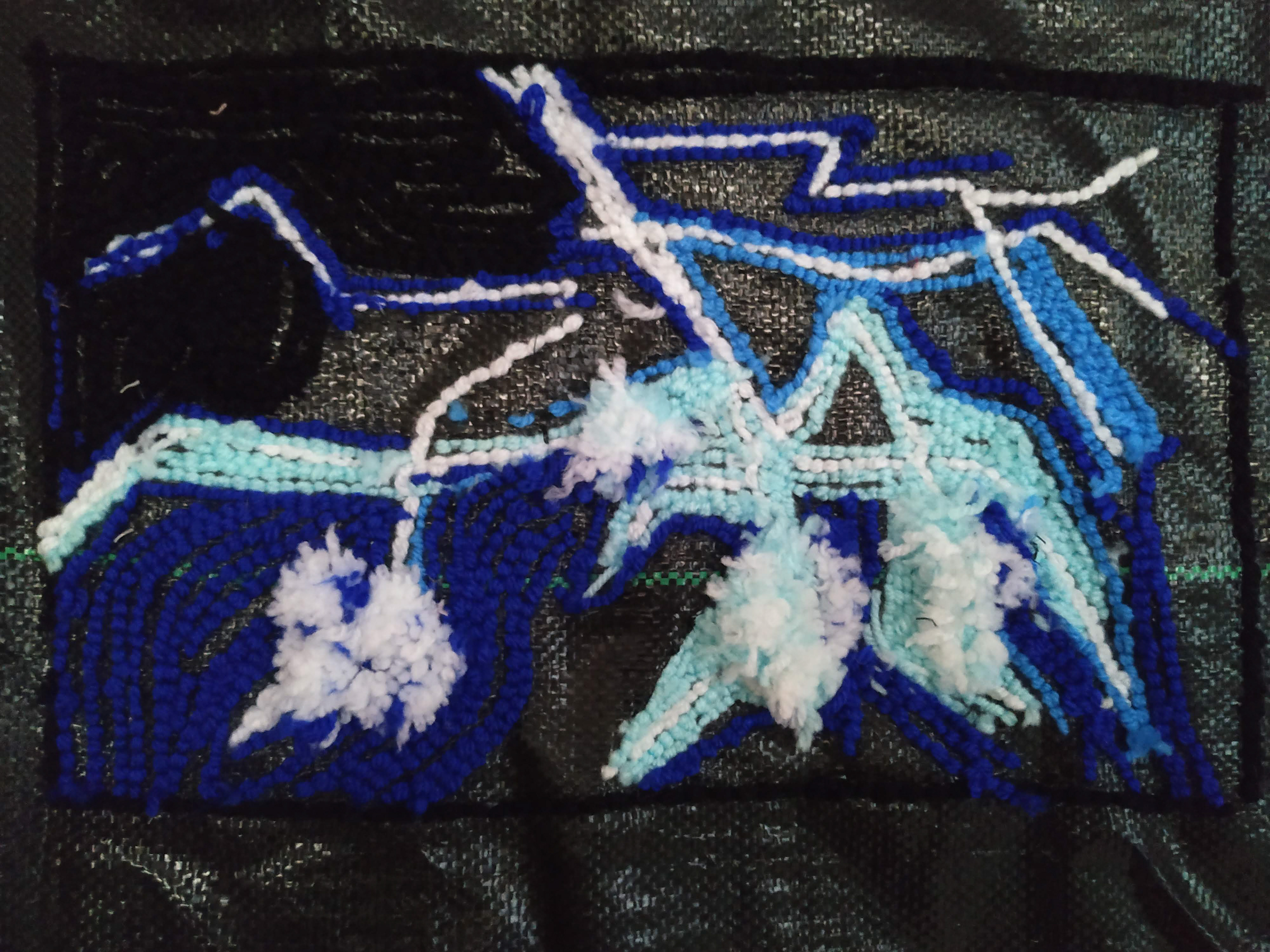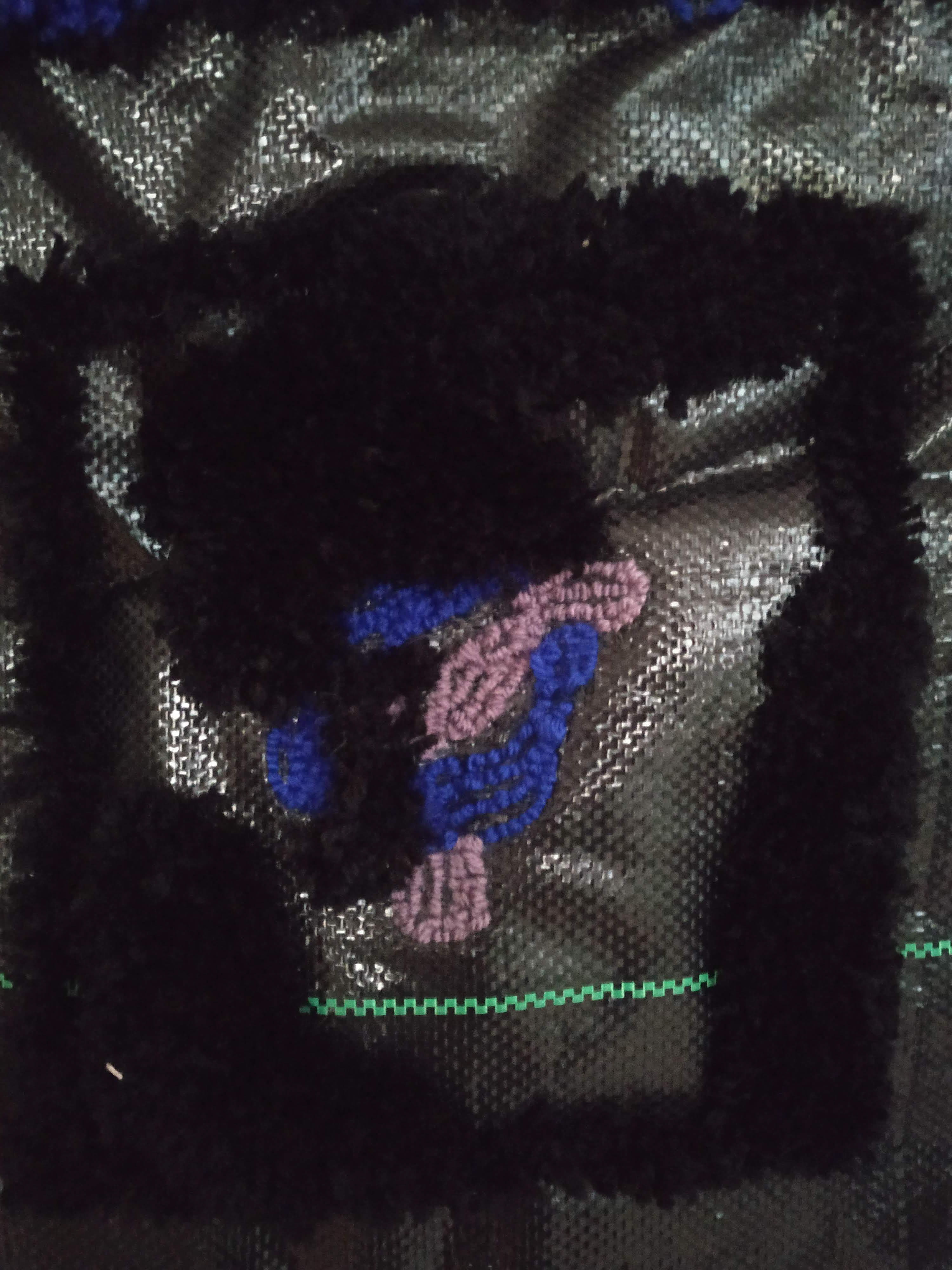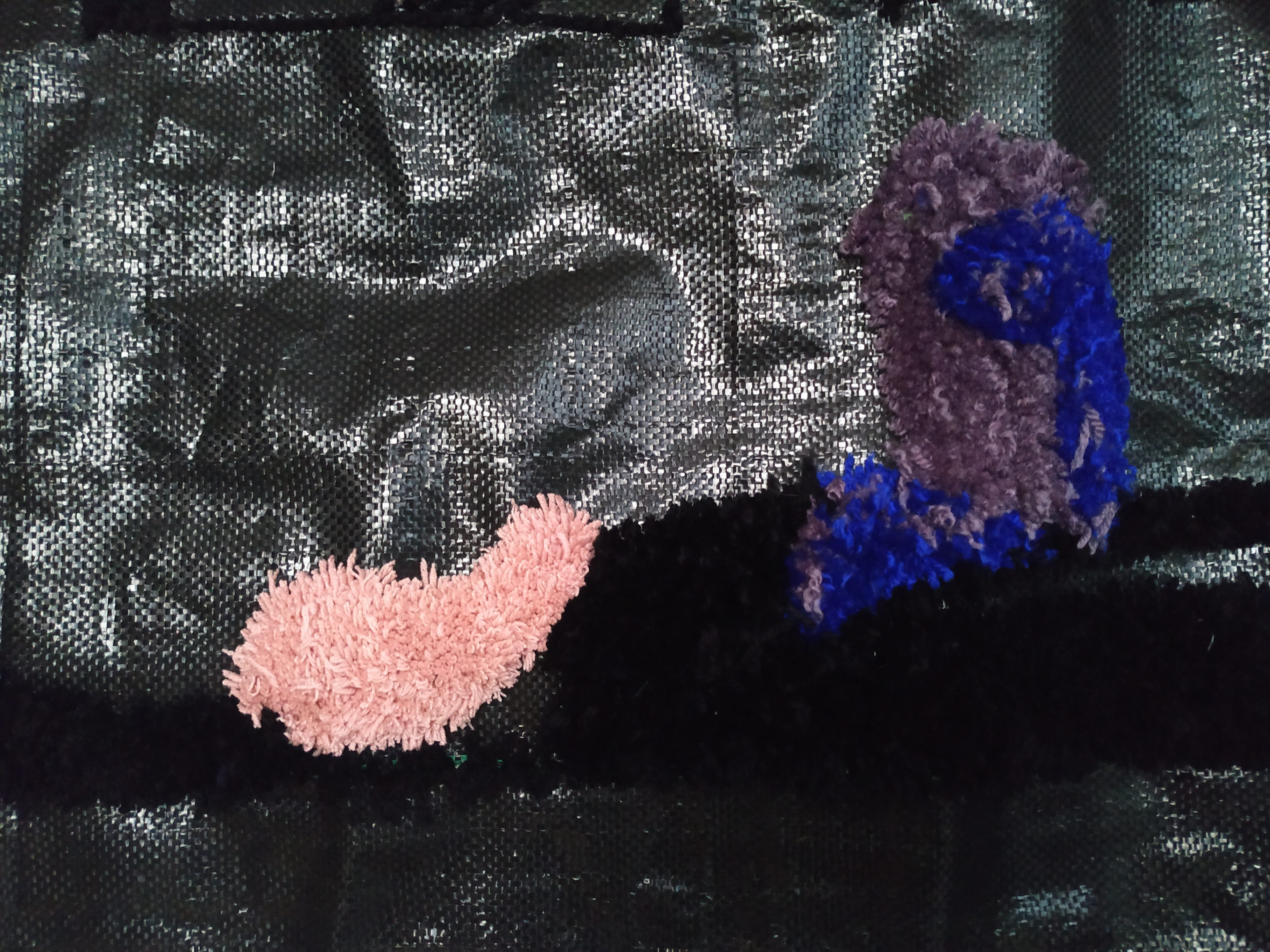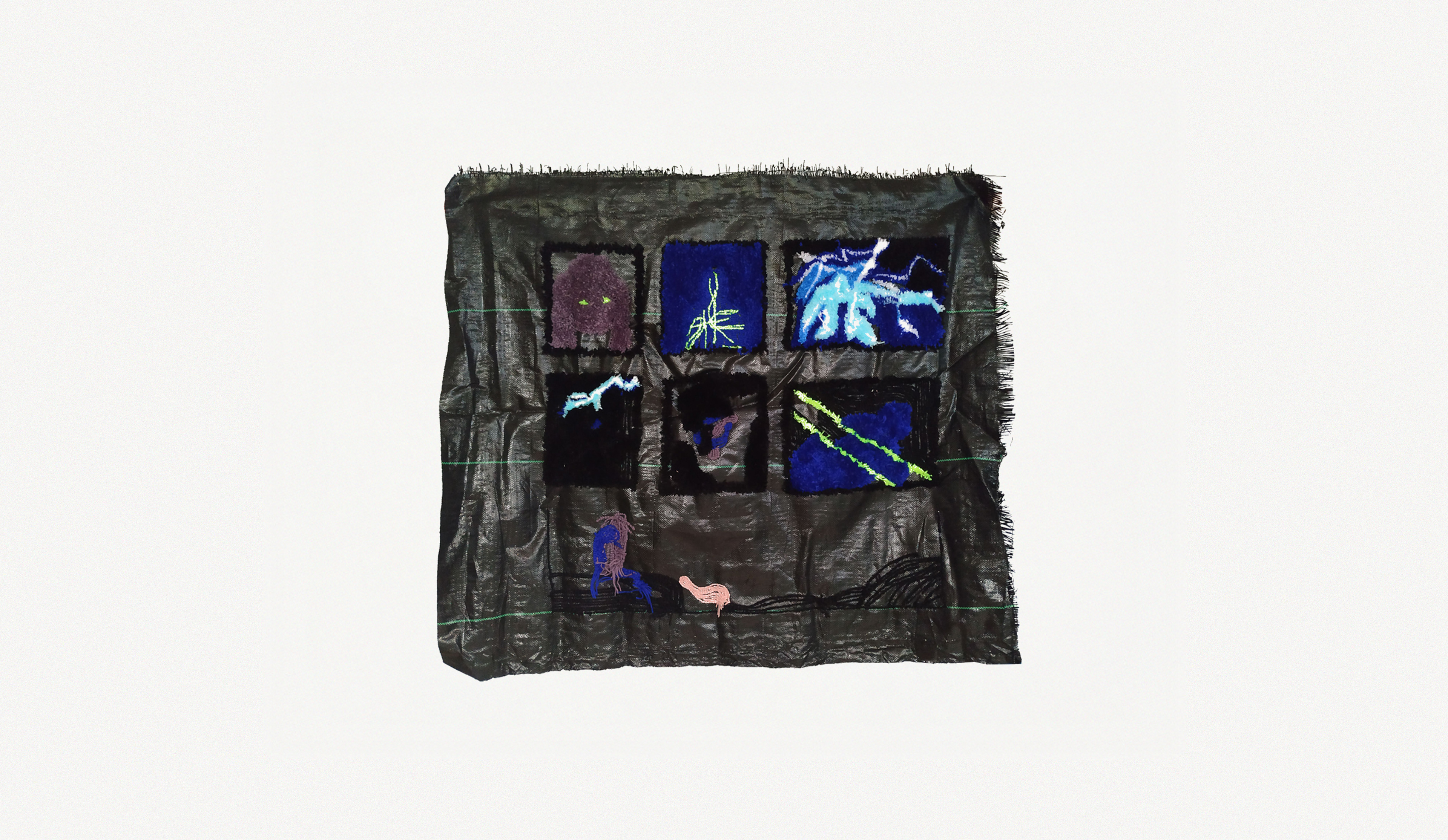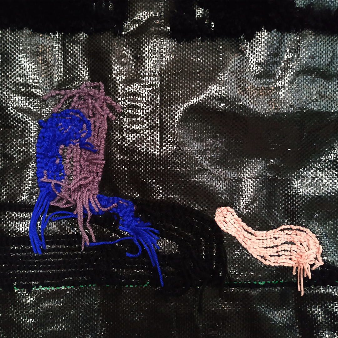 The second in a series of works in which I use a polypropylene base.The background surface is divided into frames, following the logic of a comic strip. I fill them with micro-narratives using the tufting technique. I’m interestedin exploring emotional states through working with the materialityof fabric. I bring together materials from different areas of human activity — construction, gardening,nand craft. I leave empty spaces and combine a DIY aesthetic with painterly imagery. Through this process, I search for a synthetic expression of climate anxiety.