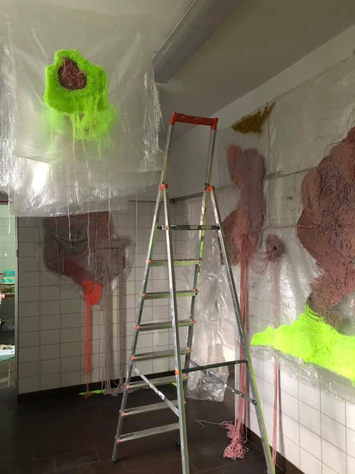 instalacja z tkanin, podkład z worków polipropylenowych, włóczka neonowa, materiały recyklingowe, nici bawełniane, włóczka z odzysku, światło UV