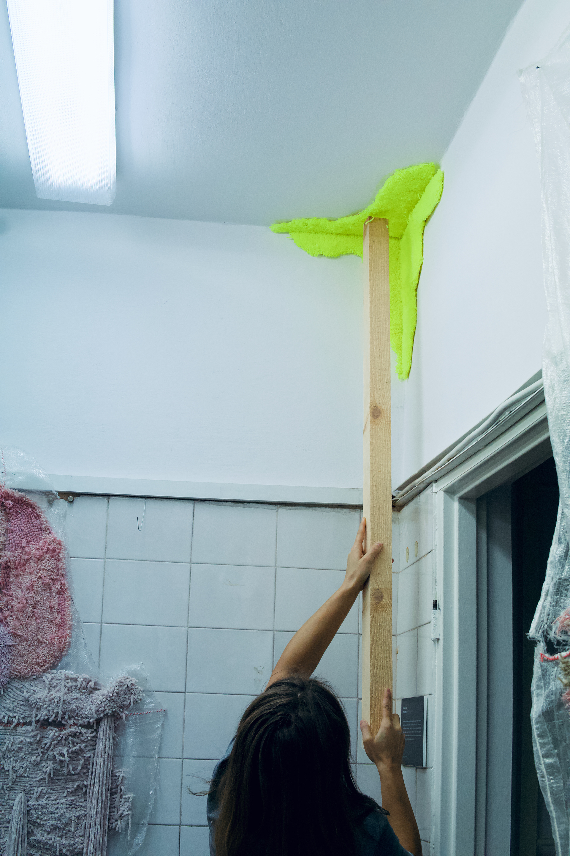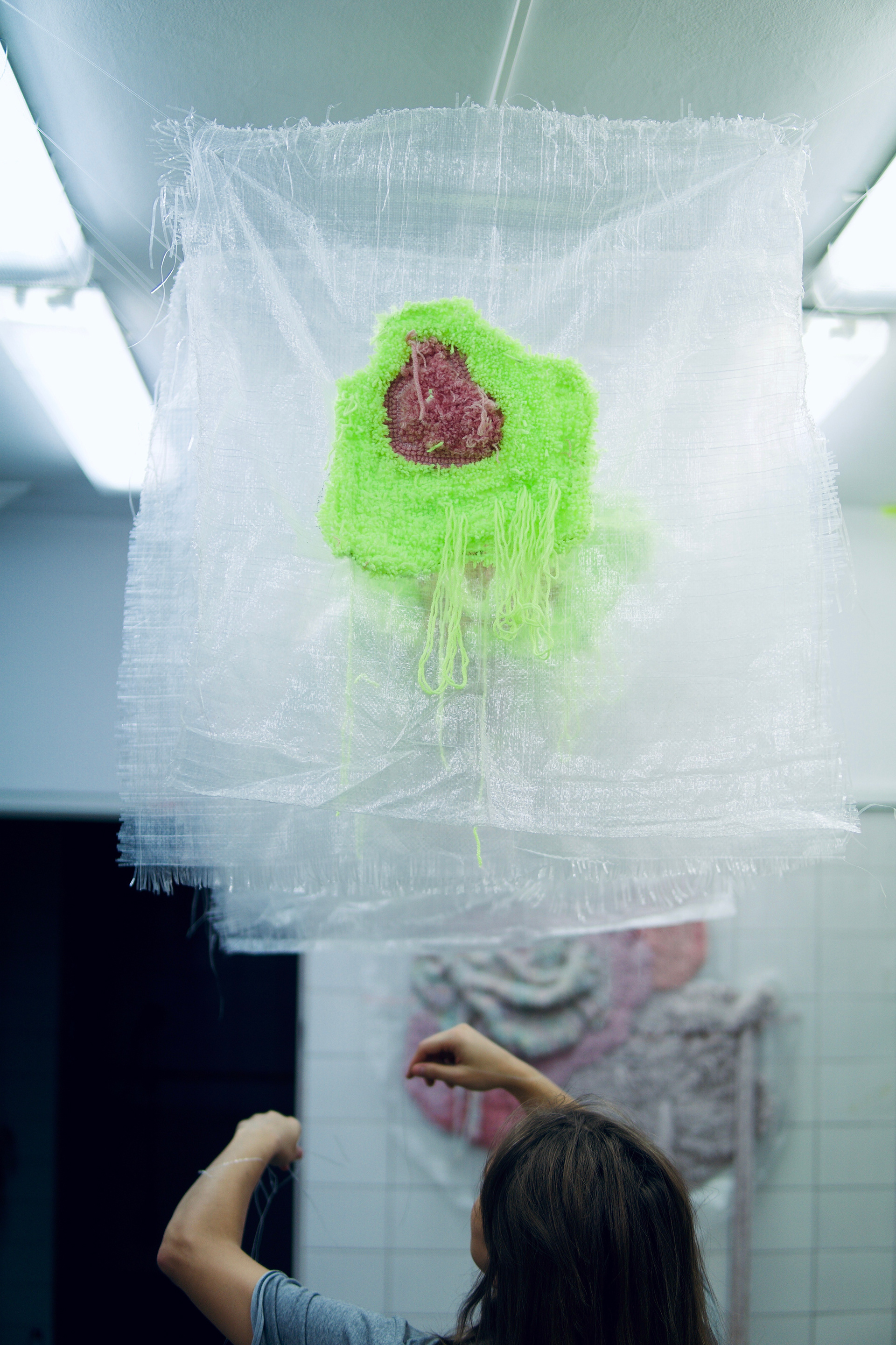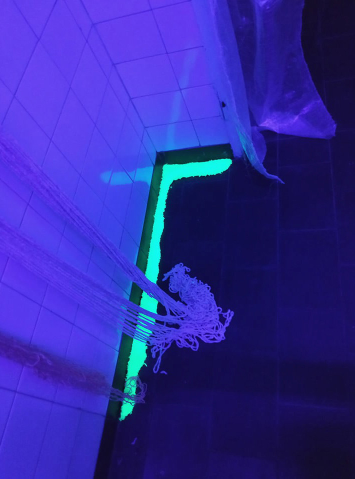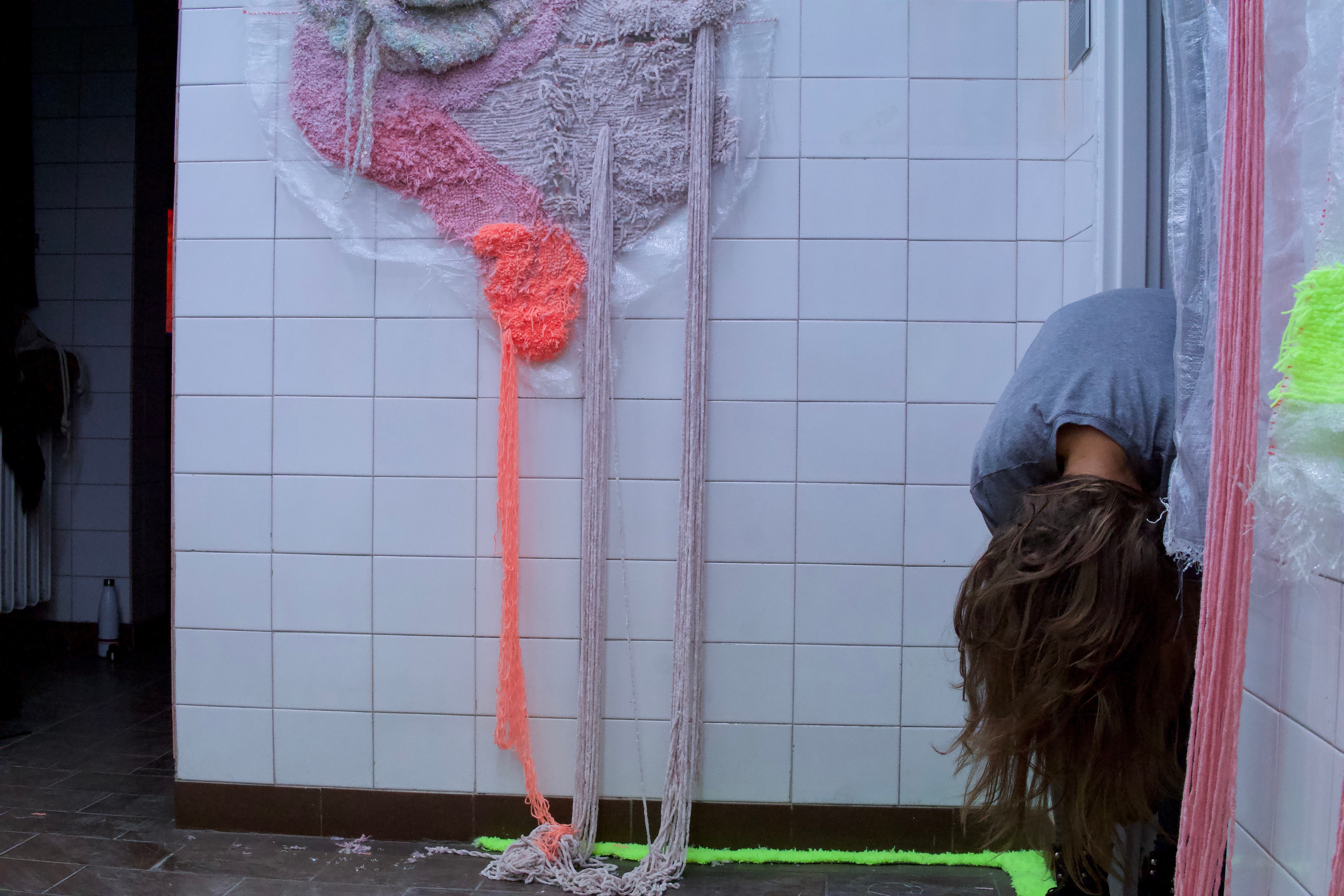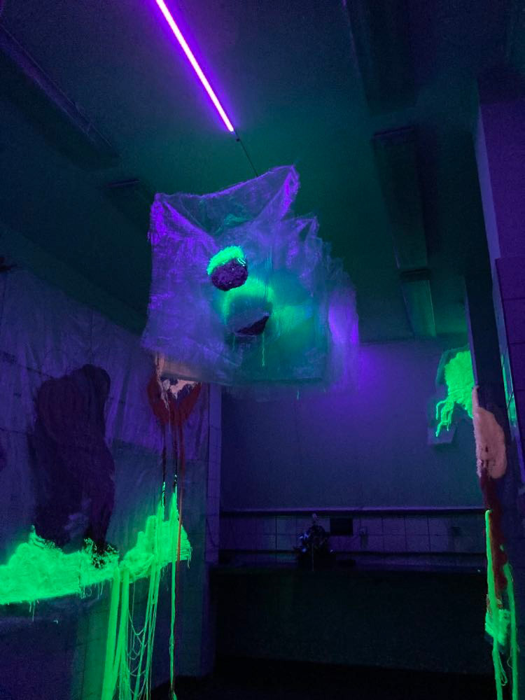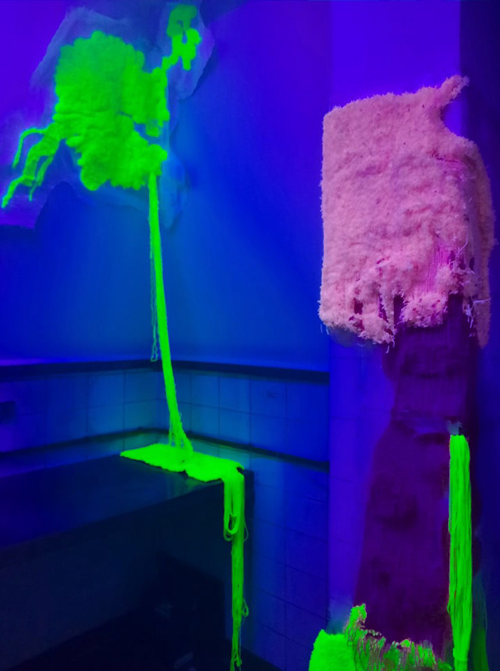 A site-specific installation realized in the space of a former hospital. It consists of carpet-like objects made from yarn sourced from unraveled sweaters and scarves, as well as fluorescent thread. At its core, the work explores the themes of organicity and decay—of bodies and architecture—manifesting in fluid, elastic forms. These create a specific relationship between what is seemingly static and constructed, and what is bodily—subject to transformation and impermanence. The boundary between these categories proves to be shifting. I use artificial neon light in the work, which emphasizes abstract, plasmatic forms within the space, pushing figurative representations into a shadowy periphery. The human figure—shown from the back, anonymous, reduced to the volume of a body—gives way to shapeless traces of organic or spiritual presence, whose identity in the context of the hospital rooms becomes collective in nature, like the overlapping bodily energies embedded in reclaimed textiles.