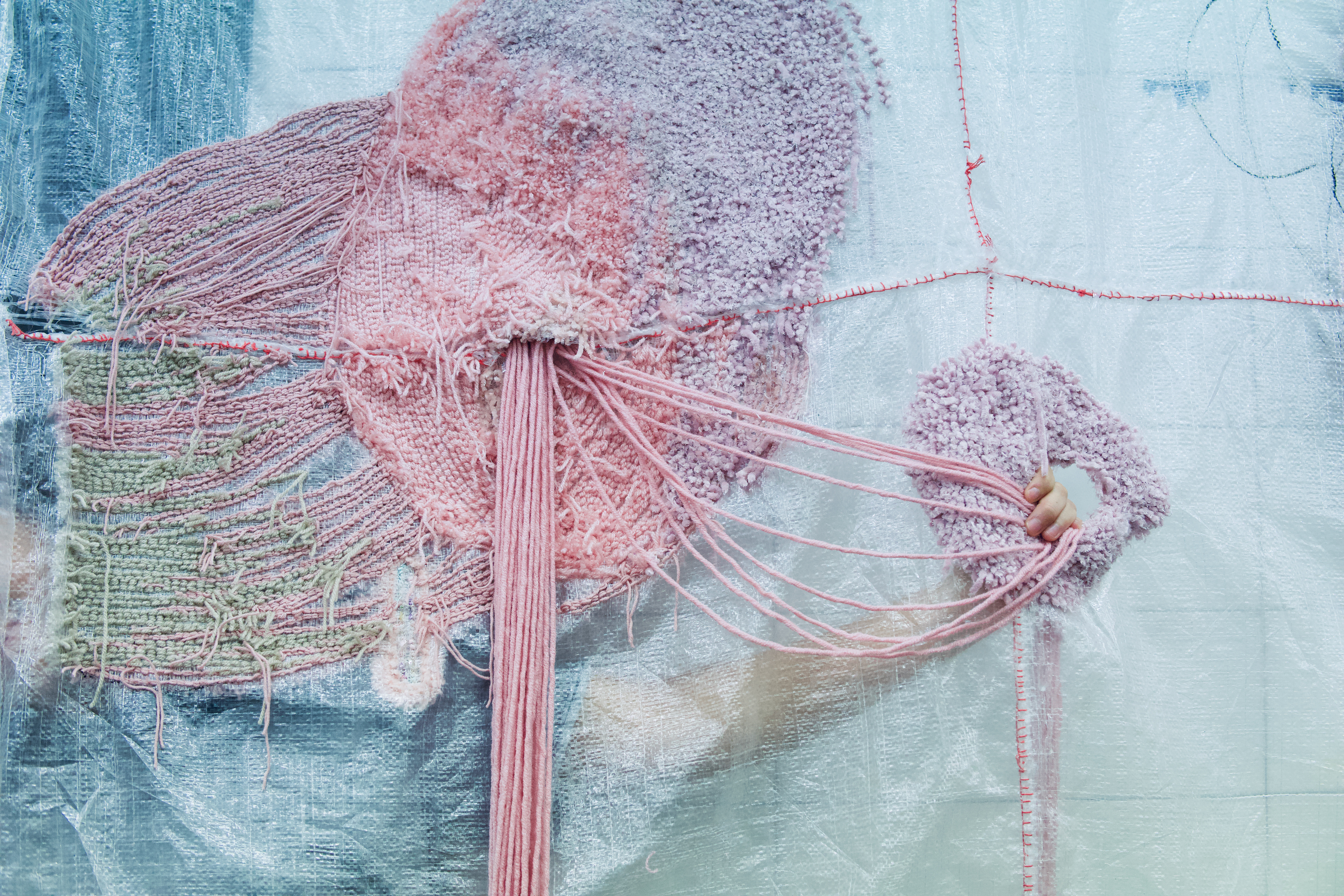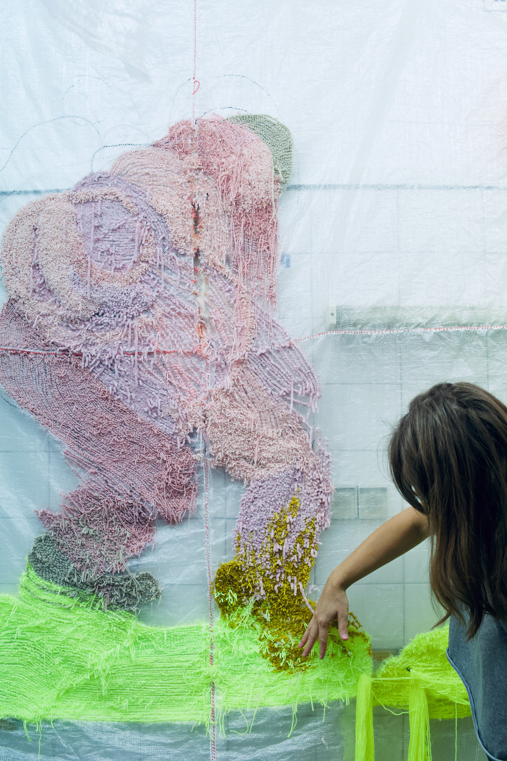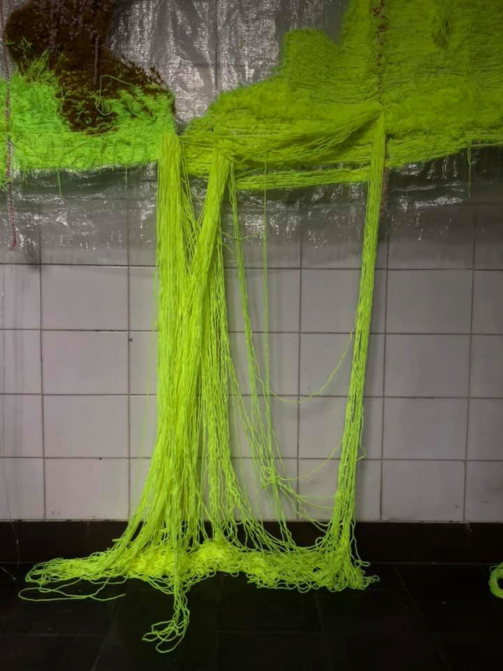 fabric installation, base made of polypropylene sacks, neon yarn, recycled materials, cotton threads, reclaimed yarn, UV light
