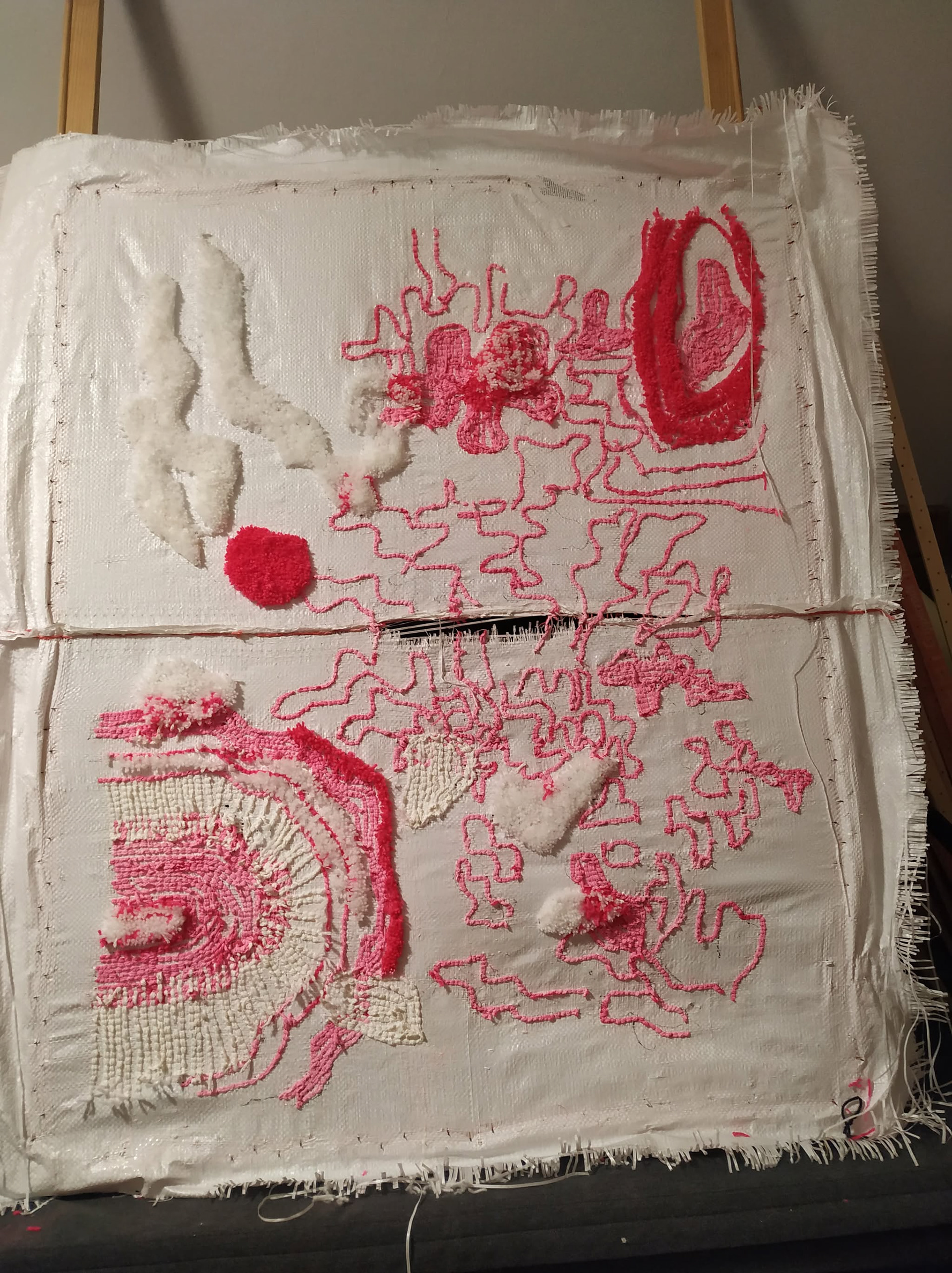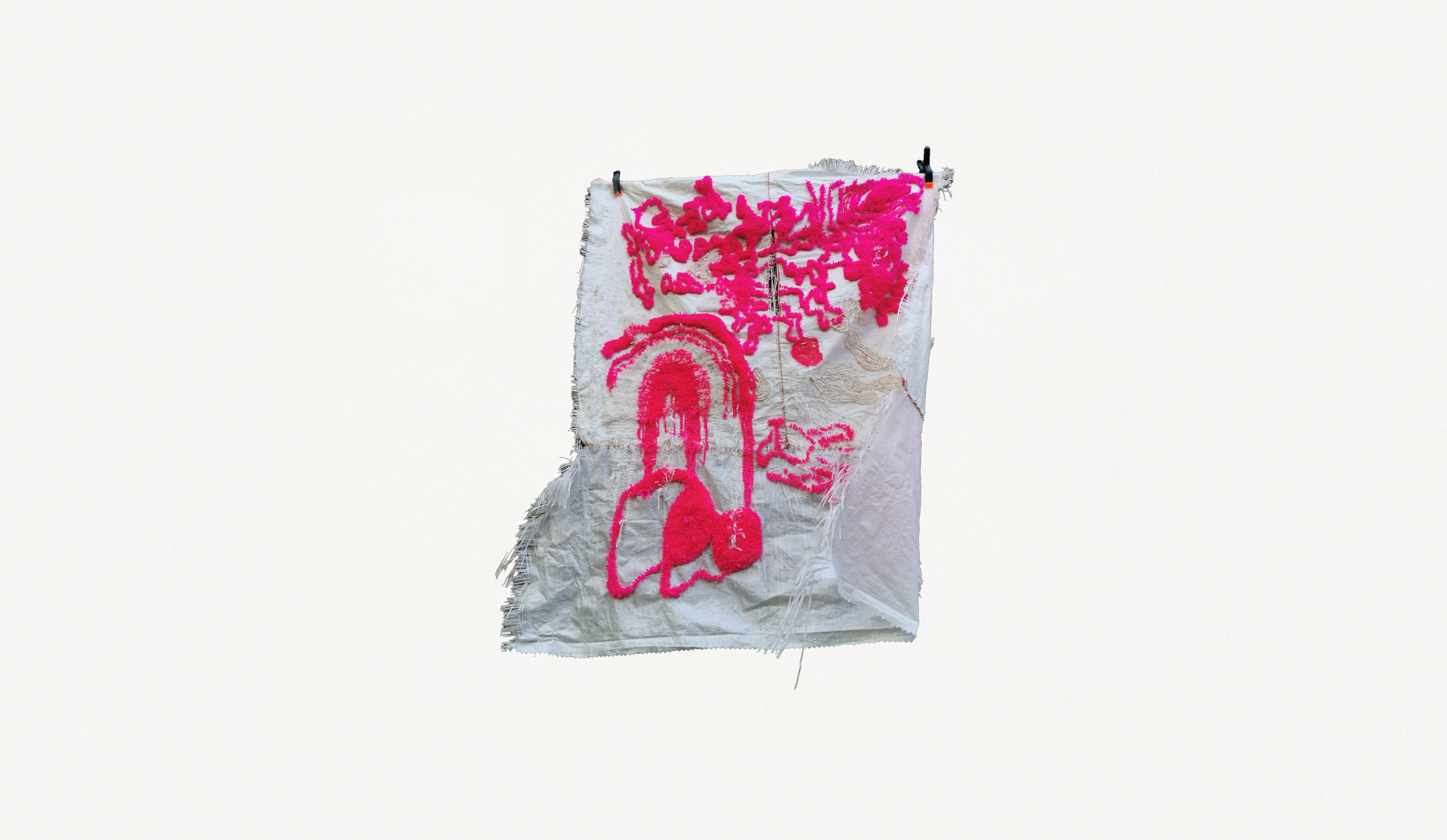 The work explores the tension between traditional artistic media and DIY strategies related to reclaiming and recontextualizing materials. The machine tufting process on construction bags blurs the boundaries between craftsmanship, art, and waste, challenging traditional aesthetics associated with painting and textiles.
