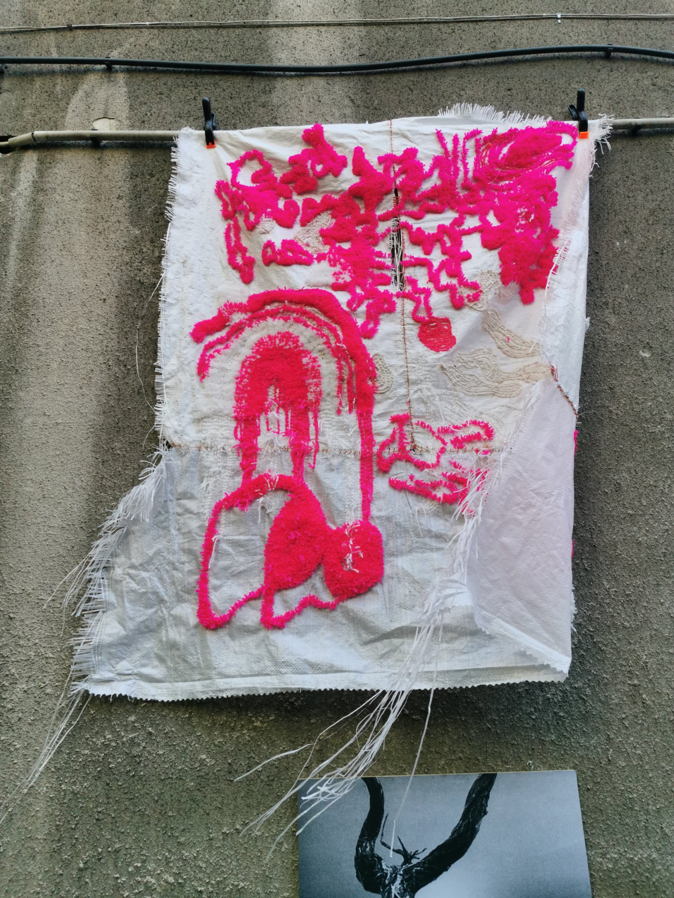 The work explores the tension between traditional artistic media and DIY strategies related to reclaiming and recontextualizing materials. The machine tufting process on construction bags blurs the boundaries between craftsmanship, art, and waste, challenging traditional aesthetics associated with painting and textiles. In the work, I address the themes of shame and reparations as a tender gesture toward marginalized, “polluted” materials. The red thread with which I stitch the fragments of the base creates scars or traces, suggesting a process of healing, repair, or acknowledgment of the past while reclaiming control over the material and its meaning.