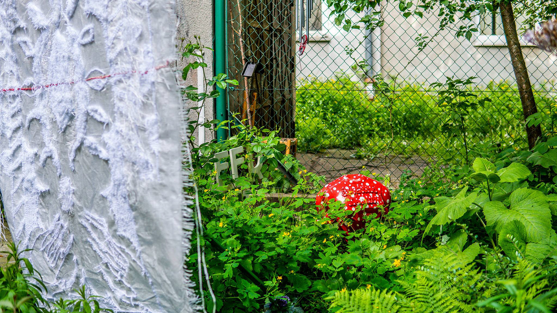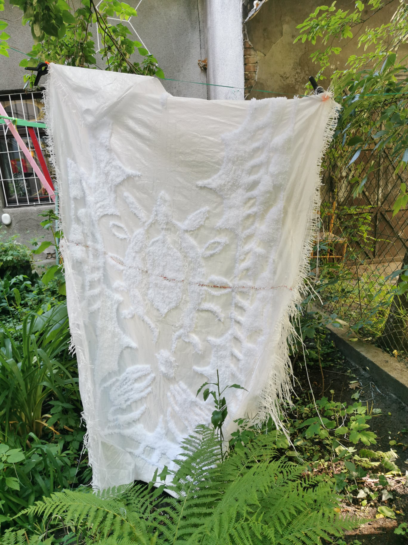 This work is the result of my formal explorations in combining various textiles, as well as a dystopian narrative about nature reclaiming control. I use white plastic fabric, juxtaposed with both natural and synthetic fibers. The patternI create resembles embroidery on a tablecloth, with a structure evocative of white mold. I am interested in the phenomenon of decay — understood not as degradation, but as a process of regeneration, where new value emerges through transformation. I address toxicity both as a principle inherent to nature, serving its survival, and as a byproduct of mass production that leads to destruction.
