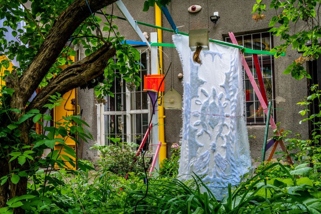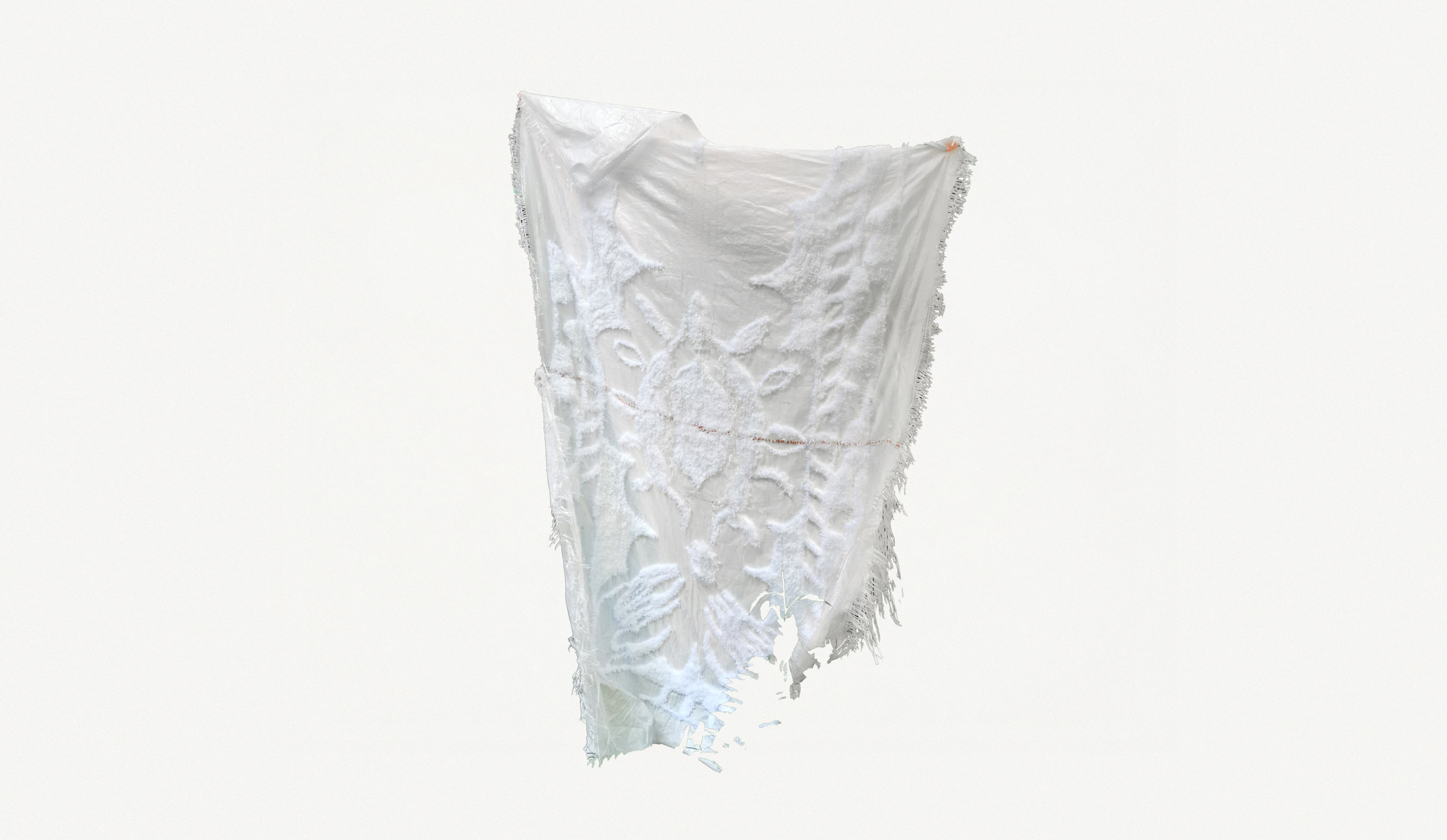 This work is the result of my formal explorations in combining various textiles, as well as a dystopian narrative about nature reclaiming control. I use white plastic fabric, juxtaposed with both natural and synthetic fibers. The patternI create resembles embroidery on a tablecloth, with a structure evocative of white mold.